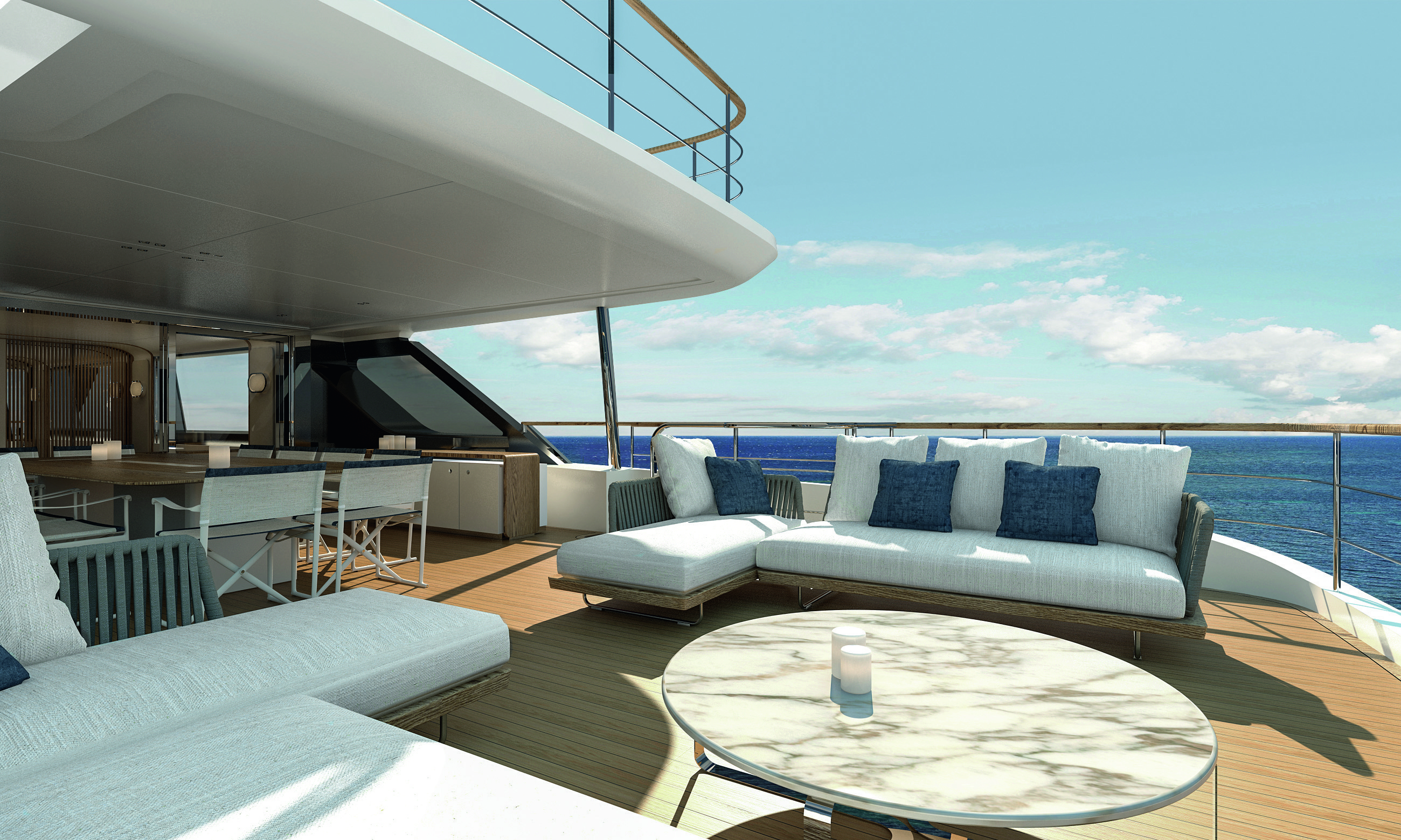 Un’elevata vivibilità di bordo e una grande razionalizzazione degli spazi sono gli elementi principali del progetto, caratterizzati da uno stile che esalta l’orizzontalità della barca nella sua lunghezza.