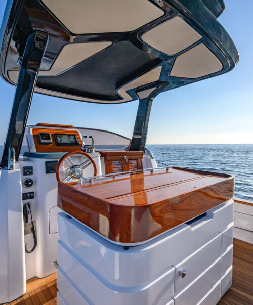 La barca  è caratterizzata da diverse soluzioni innovative, come il tettuccio rigido non imbullonato e sorretto solo da due braccia laterali, che garantisce l’ombra attraverso la rete traspirante o il mobile bar di poppa in mogano verniciato lucido con seduta nascosta, che può essere usato anche come mobile cucina.