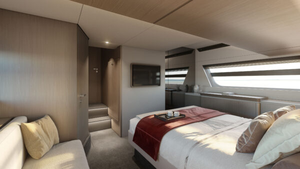 Gli spazi storage della suite sono impensabili, con una cabina armadio perfettamente attrezzata alla quale si aggiunge una seconda colonna storage, oltre ai mobiletti a mezza altezza lungo la murata destra e allo spazio aggiuntivo sotto il letto per riporre gli oggetti più ingombranti.