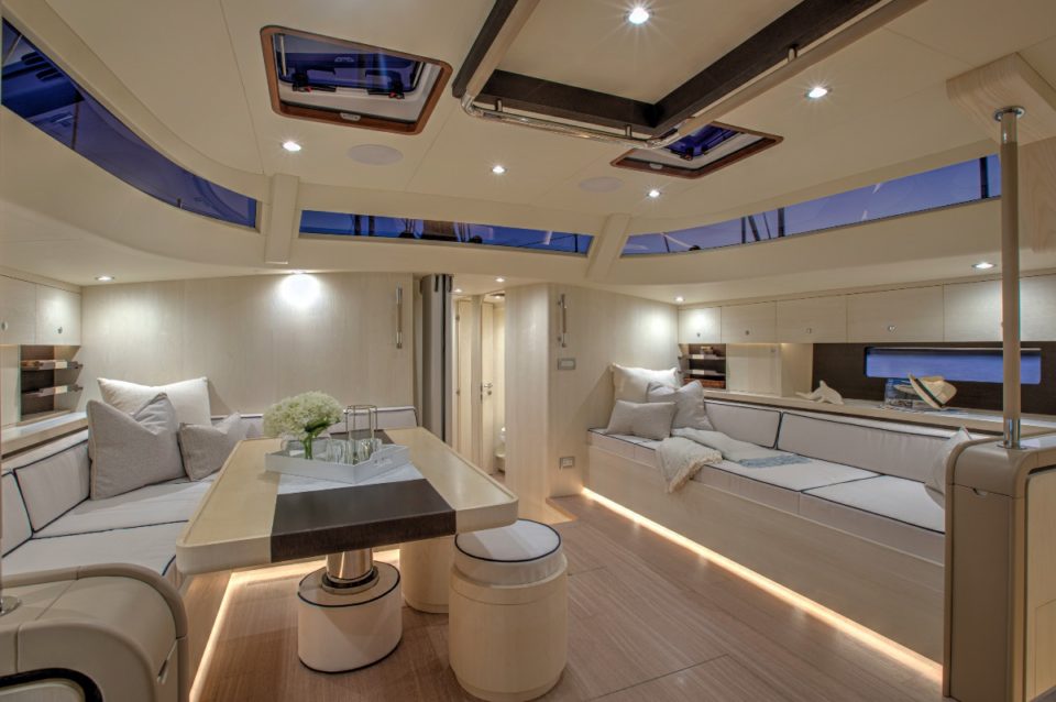 Le linee pulite sono enfatizzate, sfruttando la reputazione del costruttore di yacht per la falegnameria interna fine, esibendo allo stesso tempo una sensibilità elegante e moderna. Grandi finestre sul lato dello scafo, un baule della cabina circondato da finestre, lucernari e portelli sopraelevati bagnano l’interno con luce naturale.